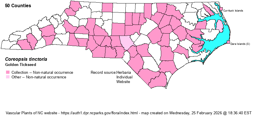 | Identification | Golden Tickseed has showy yellow rays with deep red in the basal portion. Thus, it is similar to C. basalis, but the leaf segments are much narrower (none are elliptical). Also, the disk florets have only 4 lobes (vs. 5 lobes in C. basalis). | |