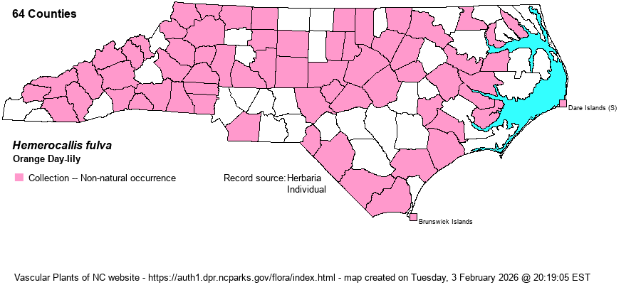 | Identification | Orange Day-lily is familiar to practically everyone, as it is so commonly planted. While many color variants are grown, only the orange one seems to escape. | |