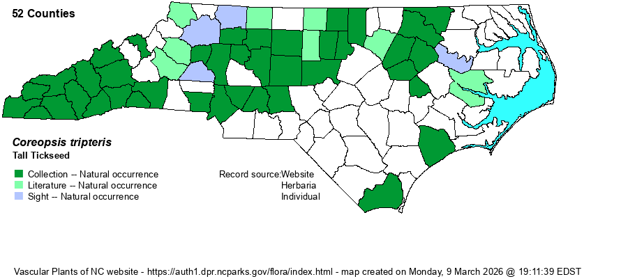 | Identification | Tall Tickseed is just that: 4-7 feet tall, and reportedly up to 9 feet. The paired leaves are numerous and resemble those of Greater Tickseed (C. major) -- each divided into 3 segments -- but have obvious leafstalks. The heads have about 8 yellow rays, the disks brown. | |