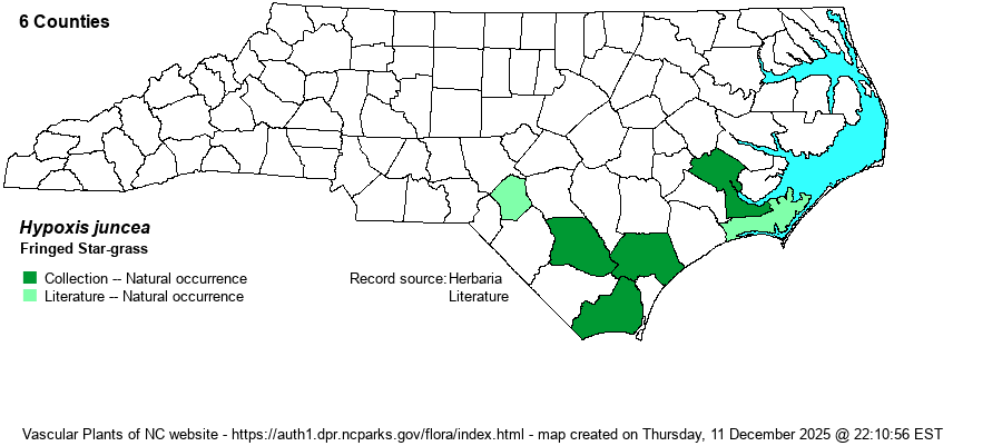 | Identification | This is the state's only star-grass (Hypoxis) with filiform (i.e., needle-like) basal leaves. All of the other five species in the state have blade-like or strap-like leaves that are over 2 mm wide as opposed to 1 mm or less wide. Otherwise, it is similar to others, with one or two bright yellow star-shaped flowers on short stems. When working in savannas, especially high quality ones with frequent prescribed burns, be on the lookout for a blooming star-grass, and check the leaves to see if you have this scarce species. | |