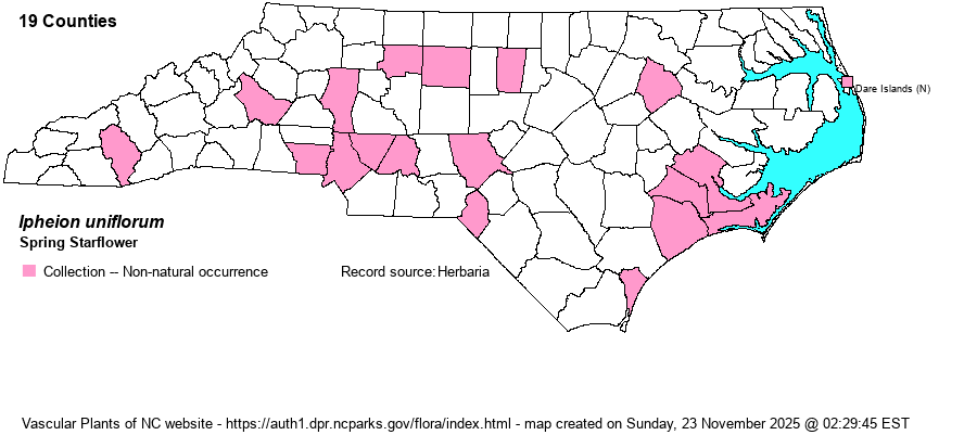 | Taxonomic Comments | Weakley (2018) listed this species as Tristagma uniflorum, but has returned it to its older name of Ipheion in 2020.