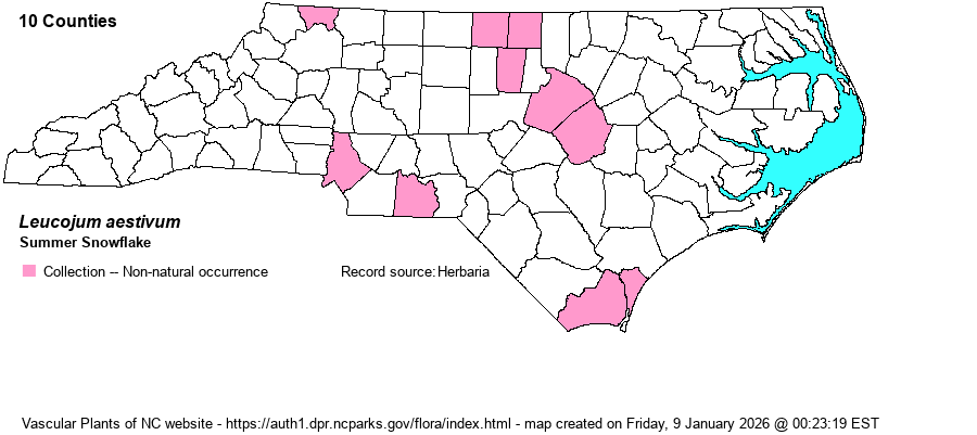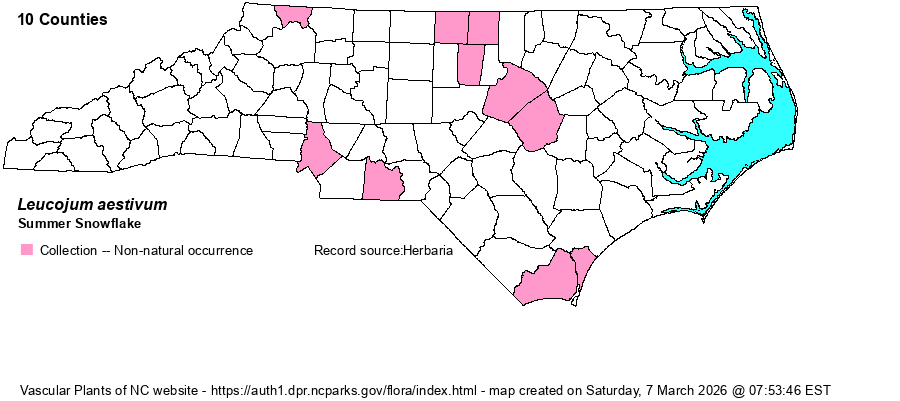 | Identification | This species grows from a bulb. The leaves are deep green, up to 1.5 feet long. The scape exceeds the leaves and has a few to several flowers on skinny stalks. The bell-shaped flowers are on long stalks and dangle so that the opening faces the ground, white with a yellow-green spot near tip of each tepal. | |
