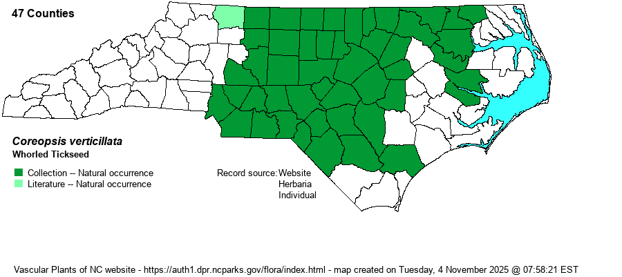 | Identification | Whorled Tickseed is easy to identify, due to its leaves finely dissected into threadlike segments. Stems usually grow 1-2 feet tall, with relatively small heads of yellow, untoothed rays and brownish disks. | |