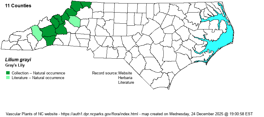 | Habitat | This lily favors cool microclimates at the higher elevations, mainly over 4,000 feet. It has a fairly wide array of habitats, though most tend to have some moisture. It grows in moist grassy balds, high elevation forests along seepages, bogs, wet meadows, and other moist forests; some can be below 3000 feet in elevation. It is best known from grassy balds such as at Roan Mountain, but it does grow well in shaded areas where there is seepage, such as at Grandfather Mountain. | |