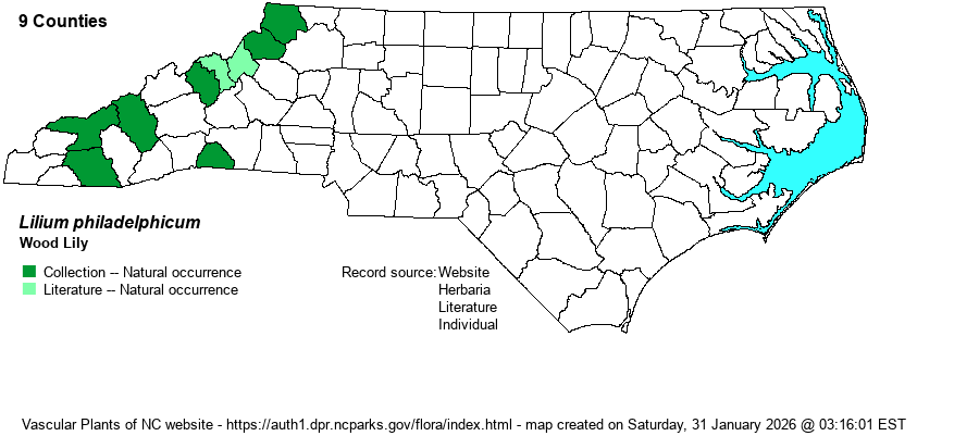 | Identification | This is a spectacular and very easily identified wildflower in the state. The only other lily with a single very large, upward-facing orange flower is L. catesbaei, which is a savanna species of the Coastal Plain. L. philadelphicum grows to 1-2 feet tall, and most stems have just a single flower, though as many as five can at times be present. The stem leaves are in several whorls, with 4-7 narrow leaves in a whorl (probably not safely identifiable just from the leaves). The 6 tepals are bright orange, with yellow near the base and brown spots within the yellow; they are narrowed at the base and grow to 2-3 inches long. The petals are spreading and slightly recurved, as in L. catesbaei. Though the ranges do not come close to overlapping, the latter species has all leaves alternate on the stem. Sadly, you are highly unlikely to encounter this scarce species on your own in NC and will likely have to visit a known site on public or other preserved land. Thankfully, it is a widespread and numerous species in southern Canada and the Northern states, so you should be able to find it outside the state. | |