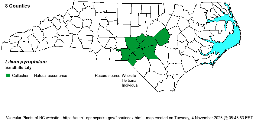 | Distribution | Occurs throughout the Sandhills region, extending slightly northeastward to Johnston County, but reports elsewhere are likely of L. superbum (such as northeastward toward the VA state line near the Fall Line).