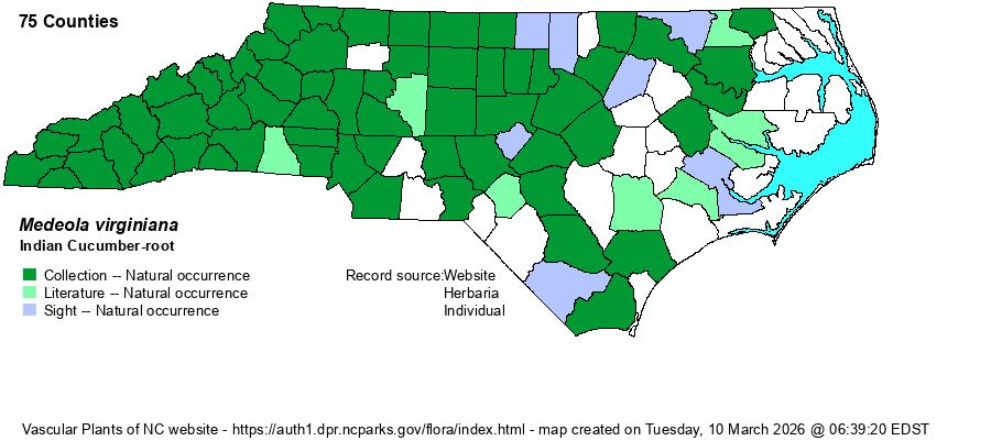 | Identification | This is a monotypic genus, being the only member of the genus Medeola. Thus, it looks like no other when in bloom or fruit; however, young plants could be confused with a few other species. When at full height, with the inflorescence, it reaches about 15-20 inches tall. It has two whorls of leaves; the one at the middle of the stem has about 7-9 generally elliptical leaves about 2 inches long, whereas the upper whorl, of three elliptical leaves, is at the top of the stem. Dangling below this upper whorl are the 3-6 small greenish flowers, each about 1/3-inch across. In the fall, the bases of the upper whorl leaves turn a deep red, and the dark purple to black berries when ripe are borne in an erect position above this whorl. However, immature plants have only the lower whorl, and at that stage can look a bit like Lilium michauxii, Isotria verticillata, or the extremely rare I. medeoloides. However, the latter two have broad and rather soft/fleshy stems, as does Lilium to an extent, and that lily also has somewhat thicker leaves that are typically obovate. The stem of Medeola is thin and quite solid and "wiry". This species also tends to grow in small clusters, more so than the others, which often grow just singly. Most biologists are quite familiar with this unique species, and many a forest walk will produce them, particularly in the western half of the state. | |