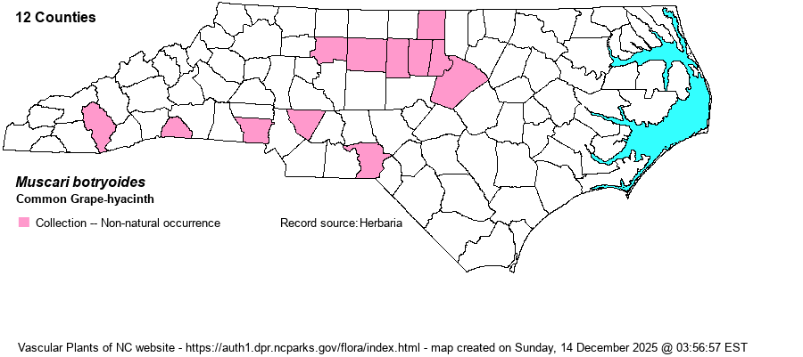 | Identification | Grape-hyacinths grow as tufts of narrow dark green leaves, with a flowering stalk 5-10 inches tall (it grows as flowers and fruits are produced). The flowers are bunched at first, dark blue and spherical-shaped. M. neglectum -- a much more common species in the state -- has leaves rounded in cross-section (vs. flat or channeled in this species), and its flowers are more tubular (longer than wide). | |