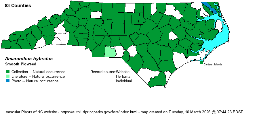 | Taxonomic Comments | In the past, specimens of A. hybridus were often mistaken for retroflexus and powellii; and vice-versa. Taxon editors cannot vouch for the accuracy of all NC identifications, though at least the overall NC range is well established to be statewide.