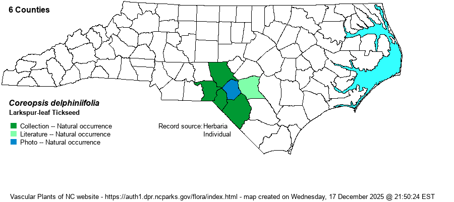 | Distribution | SERNEC (misspelled delphinifolia) has specimens from Moore, Richmond, Robeson, and Scotland counties. RAB (1968) lumps it within C. major var. stellata, but FNA and Weakley (2020) recognize it at the species level, although FNA says "questionably distinct from C. major". As Weakley (2020) accepts it as a valid species and with natural occurrences in the state, the taxon editors accept it here as native, though feel that molecular research needs to be done before truly accepting it as a valid species. Smith (1976) in his monograph treated it as of hybrid origin; DNA research is sorely needed to settle the matter. Current populations are documented from roadsides in southeastern Moore County (July 2022), northern Hoke County on Fort Bragg (June 2023), and Robeson County at O'Quinn Road flatwoods (April 2025).