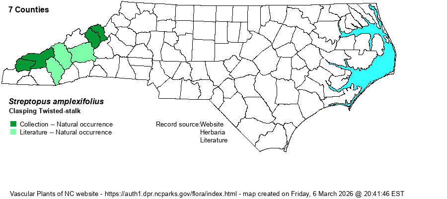 | Identification | This is a lily with a few-branched stem that reaches a height of about 18-20 inches. The scattered alternate leaves are elliptical and grow to about 3-4 inches long, with grooved parallel veins. The upper branches are quite zigzag, and a small whitish to greenish-white flower dangles below each of the leaf nodes. The flowers are bell-shaped, facing downward, each about 1/3-inch long. The similar S. lanceolatus has two major differences: its flowers are pink, and its leaf margins are strongly ciliate (hairy). S. amplexifolius has leaf margins that are generally smooth or at least barely hairy, and also its leaves are strongly clasping at the base, as opposed to clasping but not strongly so. In your wanderings at high elevations in the mountains, you are not likely to run into either species of Streptopus very often, and most of the encounters will be with S. lanceolatus. | |