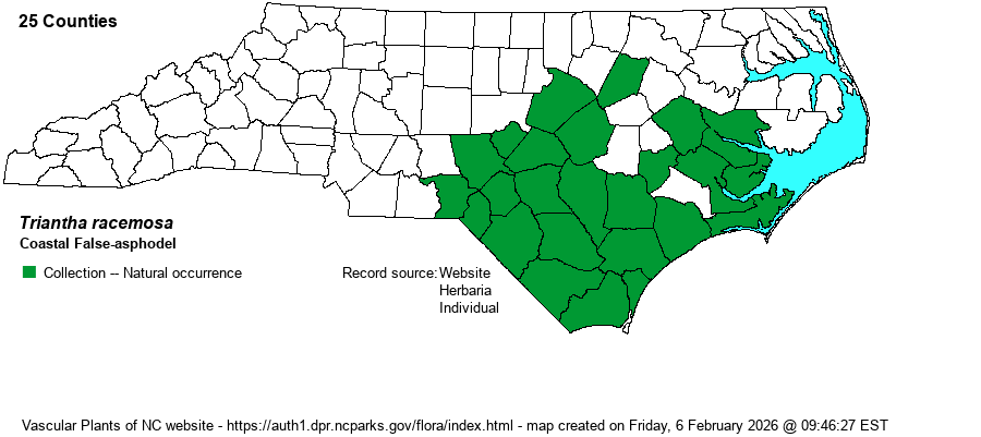 | Distribution | Occurs throughout the southern half of the Coastal Plain, including the Sandhills region, very similar in range to the visually similar Tofieldia glabra. It does range sparingly into the extreme eastern edge of the Piedmont (e.g., Nash and Wake counties), though it may well be extirpated from this province.