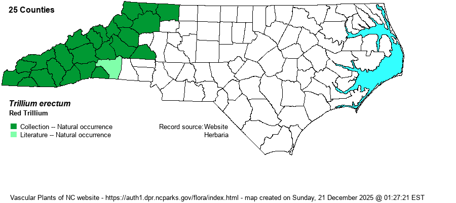 | Abundance | Common and widespread in the Mountains; infrequent to locally common in the Piedmont foothills. Found in many if not most cove forests in the Mountains. Though it occurs in many fewer counties in NC than T. catesbaei, this may be the most numerous of the state's trillium species in terms of raw number of individuals. This abundance is even so after several montane species have been pulled out of T. erectum as new species in recent decades, such as T. simile and T. sulcatum. | |