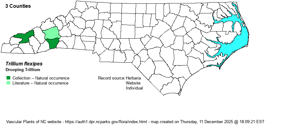 | Habitat | This is one of many trilliums in the state essentially restricted to high pH forested soils. In NC, it occurs in moist, rich coves over mafic rocks. |