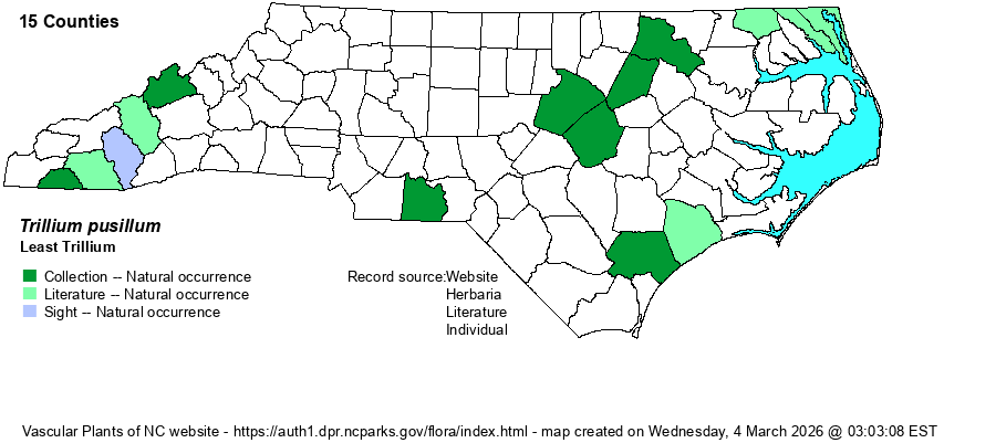 | Abundance | Rare in the Great Dismal Swamp vicinity and in Fall Line creek drainages from Halifax County southwest to Wake and Johnston counties. Very rare in the southern Mountains, and extremely rare elsewhere (but plants may be numerous where found, such as in Anson County). The species is considered as State Endangered, though technically it is the named varieties -- pusillum and ozarkanum -- that are each listed as Endangered; whereas the two unnamed varieties are listed by the NCNHP as Significantly Rare. | |