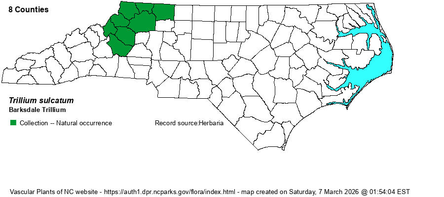 | Identification | This is a usually maroon-red flowering trillium similar to T. erectum, from which it was split out a few decades ago. Basically, it is quite similar to T. simile of the central and southern mountains of the state, though that species is white-flowered as opposed to normally red-maroon. T. sulcatum grows to about 1.5 feet tall and has large rhombic leaves averaging about 5 inches long and across. Like those two species, it has an erect flower stalk about 4 inches high, and the single flower is typically facing horizontally. The widely ovate petals are 1-1.5 inches long and nearly as wide, and thus they overlap at their bases. Like T. simile, the petals are angled forward and not flat (in a single plane as in T. erectum); as a result, the flower is cup-shaped and not in a single plane. In addition, the plant is named after the sepals, which are sulcate (grooved at the tips), though that character is likely not needed for identification. However, any white-flowered individuals could be confused with T. simile, but T. sulcatum has smaller flowers, the petals only slightly longer than the sepals, and the sepals contain some purple color. A hike on some of the mountains in Ashe and northern Watauga counties should produce this species. | |