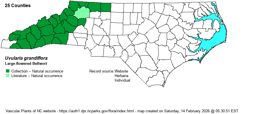 | Identification | This is a striking species when in full bloom, It grows to about 1.5-2 feet tall, and typically there are several branches off the stem. There are scattered entire and elliptical leaves along the stem and branches, and each leaf is perfoliate, such that the stem "pierces" the leaf; each leaf is about 3-4 inches long and typically droops downward. The many yellow flowers dangle downward (as do all of the bellworts), with the 6 tepals practically touching each other in a "closed" look. The flower is about 1-1.5 inches long and a bright golden-yellow, a deeper or richer color than the paler yellow of the similar U. perfoliata. This latter species has slightly smaller and paler flowers, the flowers are "pebbled"/rough on the inside, and the leaves are smooth and often a bit glaucous on the undersides. Both species can grow together on the same mountain slopes, and even when not in bloom they can be identified by experienced observers. Once in full bloom, there should be no identification issues by anyone, as U. grandiflora has bright golden-yellow flowers and is a more stately species. This is one of the many target wildflower species for those walking in rich cove forests in the spring season. | |