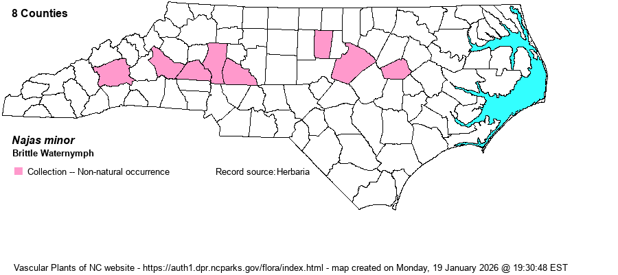 | Identification | This species is very slender, suspended in the water column, the stem much branched and these looking bushy. Check the key in Weakley (2018) for details of how to tell it from other Najas species. | |