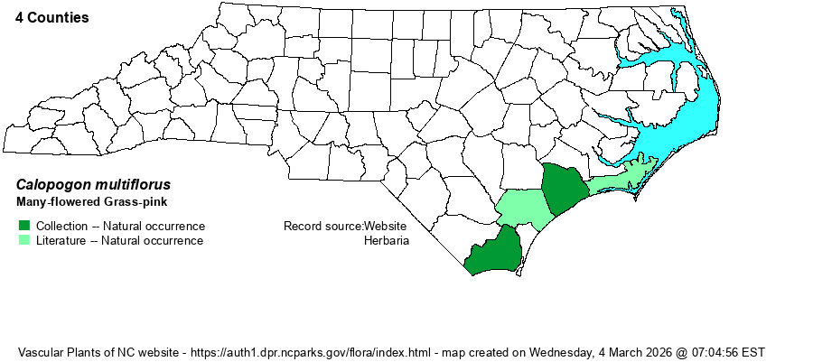 | Distribution | Only in the southeastern Coastal Plain counties bordering the Atlantic -- Carteret, Onslow, Pender, and Brunswick. The species was not detected in NC or SC until the late 1990s. It seems certain that the species was overlooked as another Calopogon species, rather than a major northward spread from FL or GA in the decades after publication.