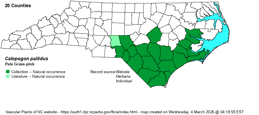 | Phenology | Blooms mainly in May and June, rarely into July, not as early as some other Calopogon species. | |