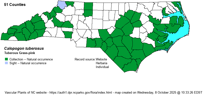 Unlike all other Calopogon species, this one ranges across all of the Eastern US and southern Canada, south to the Gulf Coast. However, it is very scarce in the Piedmont province, and in much of the area west of central TN and central KY. | |