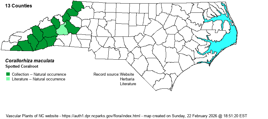 | Distribution | Recorded over nearly all of the Mountains, with only a few counties lacking records. However, alarmingly, data collected by the NC NHP indicate recent records for only three counties, mostly just a single flowering stem! Not present downstate. Photo records on iNaturalist -- the only ones ever posted from NC (!) -- are for Clay County in 2021, Buncombe County in 2023, and Ashe County in 2024, to verify that at least a few plants still survive in the state.
