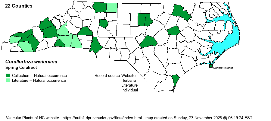 | Abundance | Formerly rare to very uncommon in the Mountains and western Piedmont, and very rare to rare in the eastern Piedmont. However, all Corallorhiza species in NC have undergone massive declines recently, perhaps much due to deer browse, and this species is now very rare in NC, though not quite as in danger of extirpation as is C. maculata. The NC NHP does list the species as Significantly Rare, with an S1 state rank; however, it needs to be added to the State Protected list soon, as Endangered or Threatened. | |
