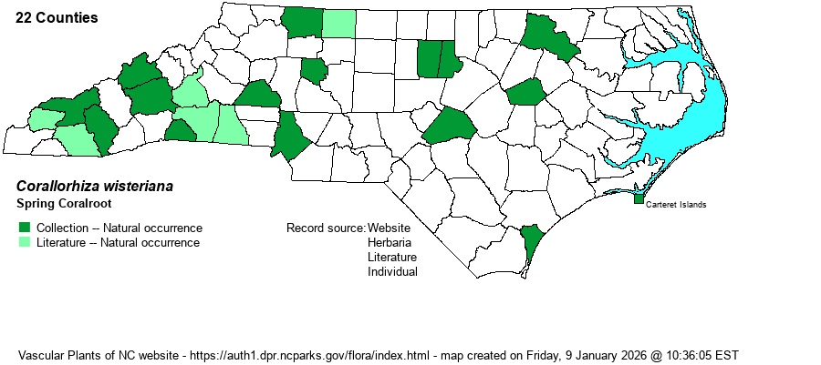 | Habitat | Unlike the other two coralroots, this species is essentially limited to high pH forested soils, more so than most all other orchids (which are often found in acidic soils). It is mainly found in Rich Cove Forests and Basic Mesic Forests, but it can rarely be found in drier forested habitats but still over limestone, shell middens, and mafic rocks. | |