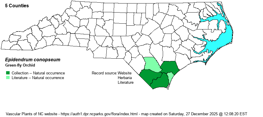 | Taxonomic Comments | The species was known as Epidendrum conopseum in much of the 20th Century (i.e., in RAB 1968). A few references use E. magnoliae, but most keep it as E. conopseum.