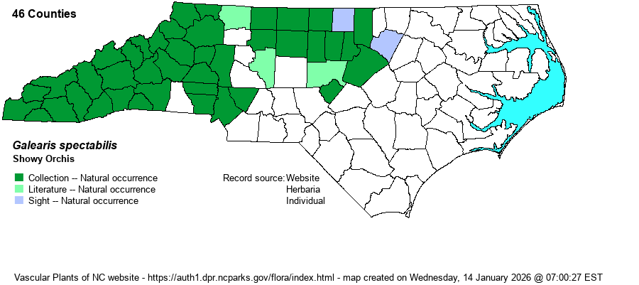 | Identification | This is a rather low orchid, but quite spectacular and easy to spot when in bloom. It is familiar to folks in the western part of the state, but less so in the central portions. It has two wide, large basal leaves, which are elliptical, entire, shiny, and grow to about 4 inches long on average and nearly as wide. They generally grow flat on the ground, but they may spread somewhat upward. Note that the basal leaves of Purple Twayblade (Liparis lilifolia) are very similar, and you may need the inflorescences to help you separate the two. In bloom, Showy Orchis has a flowering stalk of perhaps 5-6 inches tall, with often 5-15 flowers present. The sepals and petals form a bright rosy-pink hood, over the large white lip. (Flower color can be variable, and some can be all white or some all rose-pink.) Each flower is typically about 1 inch long (vertically), and thus the flower cluster is hard to miss in the spring when in bloom. Several individuals may grow so close together that there appears to be numerous basal leaves and numerous flowering stalks from "one plant". When on wildflower walks in the spring in the mountains and Piedmont, this is one of several key targets to spot on the trip. | |