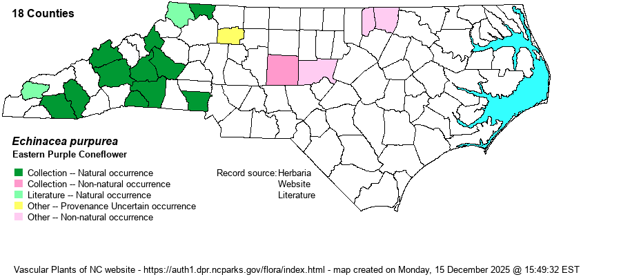 | Distribution | Low Mountains and upper Piedmont, rarely to the central and eastern Piedmont. Records east of the foothills are undoubtedly adventive or escapes from cultivation. Mecklenburg County specimens are from cultivated plants. The Naturalist website has photo records for most counties in the Mountains and Piedmont, but the website editors are not using them to populate the map, as most are probably at planted locales.