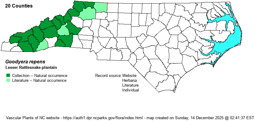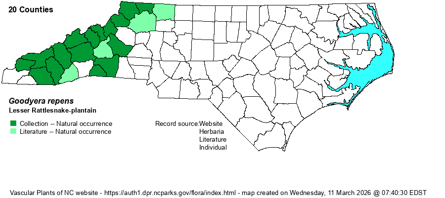 | Habitat | This species has much more restrictive habitats than its "cousin" -- Downy Rattlesnake-plantain (Goodyera pubescens). It is limited mainly to moist, shaded places beneath conifers or evergreen shrubs in cool micro-habitats, such as wooded slopes, ravines, and near streams. With the demise of Eastern Hemlock (Tsuga canadensis) in our mountains, this loss may have a negative impact on the distribution and abundance of this orchid. It grows well under stands of Rosebay Rhododendron (Rhododendron maximum), which thankfully is abundant and not obviously in decline in the mountains and foothills. It can also be found growing with various mosses in damp shady places. | |
