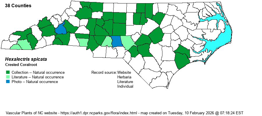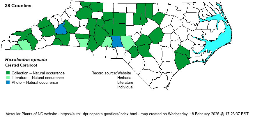 | Identification | This can be a difficult species to spot because it is saprophytic, lacking chlorophyll (and has no green color) and thus it blends into the background of the forest floor. It has a single herbaceous stem growing to 1-1.5 feet tall on average; the stem is pinkish to rusty-colored, and the top portion contains around 10 widely scattered, large flowers, about 1 inch across. Leaves are tiny and scale-like, hardly noticeable. The flowers are flesh to rusty colored, but there are usually purple stripes on the flowers. Thus, when in bloom, this is quite a striking plant, but as it is a rare species and is above ground for such a short period in late summer, it is difficult for a biologist to stumble onto them. As with many other saprophytic plants, such as Indian-pipe (Monotropa uniflora), a handful of plants can grow in close proximity. However, you are not likely to see more than 5-10 plants at any site. The only similar species is Puttyroot (Aplectrum hyemale), but that plant flowers in the first half of May, on average, and is either showing fruiting capsules by midsummer or has disappeared, leaving only a large basal leaf (which Hexalectris lacks). | |