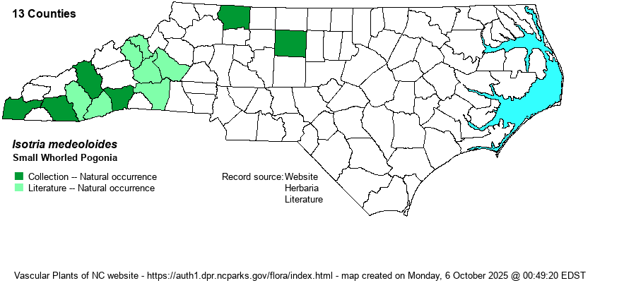 Identification | This is a rather short, though erect species, with a single stem growing only to about 6-10 inches high. The green stem is rather fleshy and glaucous to glaucescent. The tip of the stem contains a whorl of normally five entire, elliptical leaves, each about 2-2.5 inches long and about 1 inch wide; they are pale green to glaucescent green and stand out at right angles from the stem. At the junction of the leaves grows a single (rarely two) flower, generally with yellow-green petals and sepals and a white lip; the flower is somewhat less than 1 inch long and wide. Two other species could grow with this species and be confused with it, and both are much more likely to be found by an observer. Isotria verticillata grows slightly taller and is not glaucous to pale green in color; it has a purplish stem and a much larger flower with much longer sepals. Medeola virginiana is a reasonably common species and is often found by the casual observer. It has a more slender and solid stem, which is generally purplish in color, usually has more than five leaves in the whorl, and (when in bloom) has several small flowers atop a second whorl of leaves. Sadly, I. medeoloides often fails to appear aboveground even though it is a perennial plant; also, seldom are more than two or three plants seen at any one site. Thus, its microhabitat requirements seem to be quite specific. | |