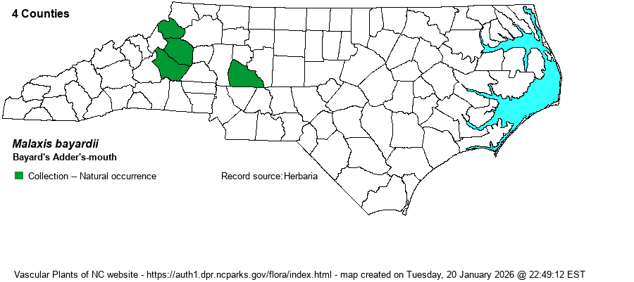| Distribution | This is a poorly known species owing to its fairly recent split out from M. unifolia; the two species are extremely similar in appearance and as a result M. bayardii is likely overlooked. Thus the NC range of the species -- right now known only from the Piedmont in Rowan County plus Burke, Caldwell, and Watauga counties in the Mountains -- is certainly incomplete. In the Mountains, recorded from the vicinity of Table Rock Mountain (1890) and vicinity of Blowing Rock Mountain (1890-93). The Buncombe County specimen was actually from Burke County. For a detailed description, drawings, and distribution maps, see Catling (1991). Photos of a few plants from Macon County in 2022 on iNaturalist have been deemed by a few experts as this species; however, this location is much farther south than previous specimens, and there was considerable discussion, as supposedly the colony included individuals of M. unifolia, a questionable situation. The editors have chosen not to map this occurrence.