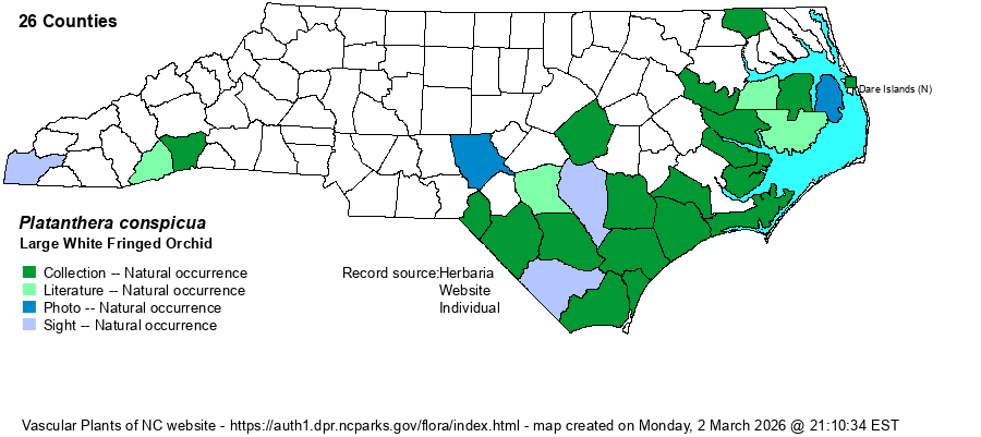 | Taxonomic Comments | This taxon was formerly included within P. blephariglottis (broad sense) until recently. Many references, including Flora of North America, list it only as a variety -- P. blephariglottis var. conspicua -- whereas Weakley (2018) and a few others have raised it to full species status. Note that nearly all NC Platanthera species were formerly within the genus Habenaria.