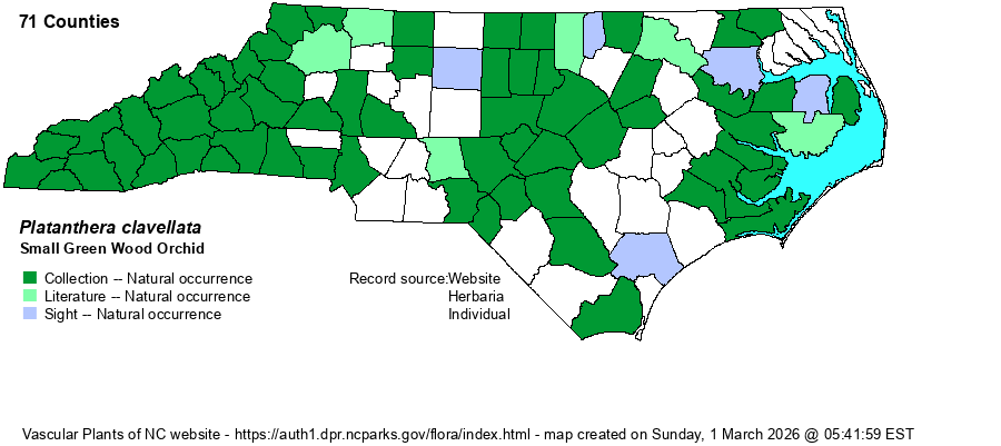 | Abundance | This is the most numerous Platanthera species in the state, being fairly common in the Mountains and Sandhills, but uncommon and easily overlooked in the Piedmont and the Coastal Plain. | |