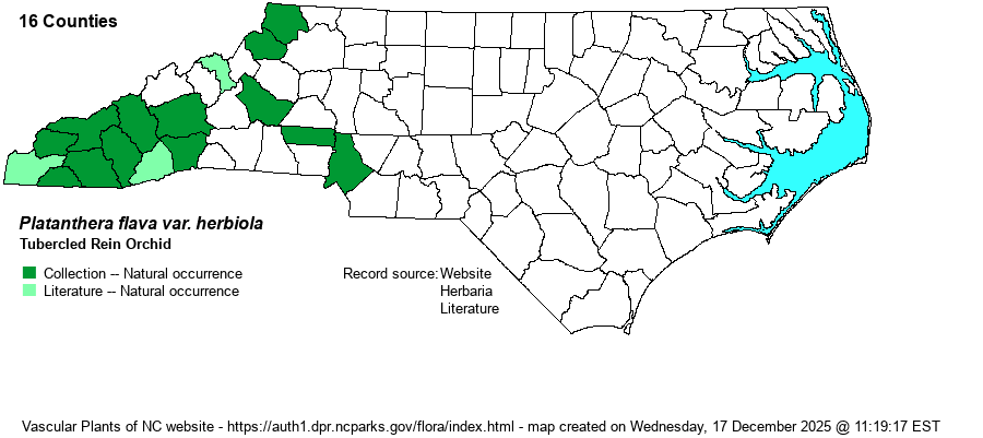 | Distribution | This taxon was considered as a full species -- Platanthera herbiola -- for a few years by Weakley in his floras; however, in 2023 he moved this taxon back to a variety of P. flava. This is the montane portion of the full species' range in the state. In NC, it occurs throughout the southwestern third of the Mountains, and is scattered farther northward in that region. It apparently sparingly occurs in the adjacent Piedmont; P. flava var. flava is found in the central and eastern Piedmont.