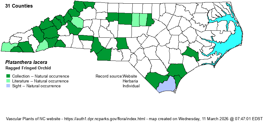 | Abundance | Rare to uncommon, at least locally, in the Mountains. Very rare in the Piedmont and southeastern Coastal Plain, strongly declining in these regions, and certainly now extirpated from some of these counties. Mainly just in the Mountains now, with a few isolated extant downstate populations. | |