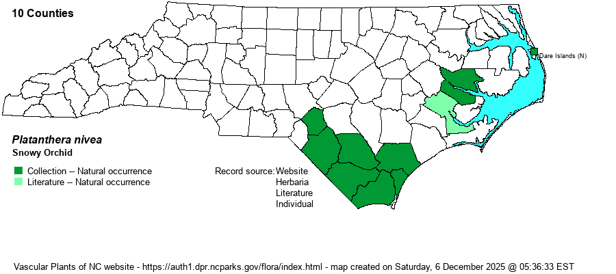 | Abundance | This is one of the saddest conservation stories in NC. This species has been recorded at least 17 times (NC NHP database records), and from at least 10 counties. Sadly, it has not been seen since the 1990's and the NC NHP has moved the state rank from S1 to SH (historical) in the last few years. One website editor (LeGrand) was fortunately to see a moderate colony in bloom in Pender County in the 1980s. Weakley (2018) states that "This species is even more irregular than most Platanthera in its flowering, whole populations sometimes not flowering for a number of years." As a result, there is still hope that it can be rediscovered in the state, especially at savanna sites that have been long fire-suppressed (if burning is re-started). This is a State Endangered species, upgraded from State Threatened in May 2021. And, in 2022 NatureServe upgraded its Global Rank from G5 to a much more concerning G3G4. | |