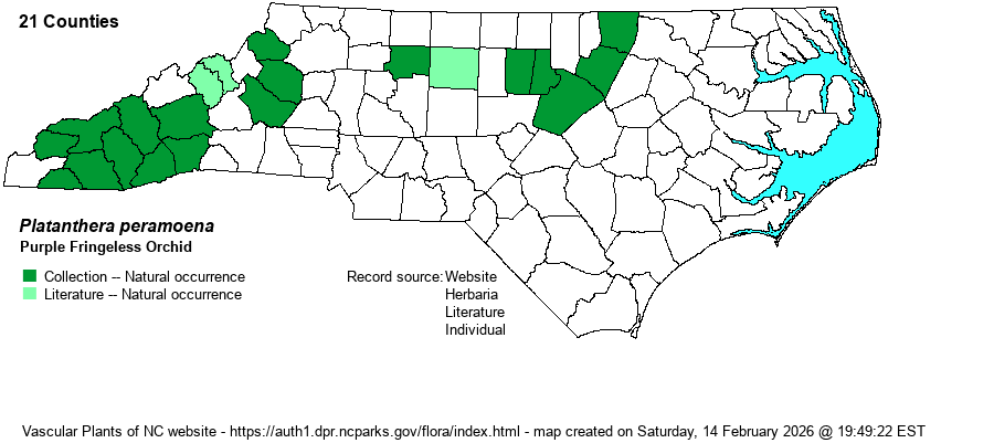 | Identification | This is one of the state's showiest orchids when in full bloom. The stems are about 2-2.5 feet tall on average, with several ascending leaves along the stem. The top 5-6 inches of the stem contain the rather open cluster of about 20-25 bright rose-purple flowers, each about 1 inch across. Unlike the other purple or rose-colored Platanthera species, this one has no fringes on the three parts of the lip; each section is simply fan-shaped without any deep serrations. At a distance, the plant looks quite like a Phlox species when in bloom; however, up close the flower looks nothing like a phlox flower (with its five petals). A few NC populations contain 20 or more individuals, though mostly it is found just as singles or a few plants in a given pool or seepage. | |