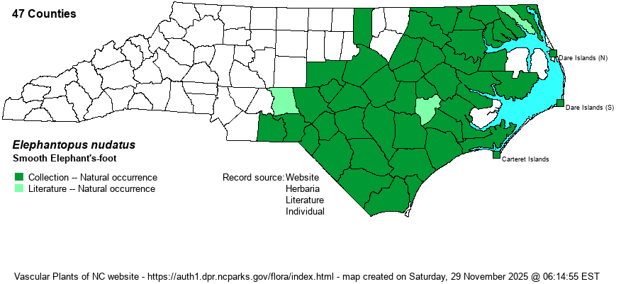 | Identification | Smooth Elephant's-foot has a few to several large, broad, basal leaves that form a rosette flat on the ground. The outer end is much the widest part of the leaf. One to a few stems grow 1-2.5 feet tall, generally hairy, terminated by several red-purple heads (disk florets only) sitting on 3 triangular leafy bracts. Common Elephant's-foot (E. tomentosus) is very similar but its stems are generally more densely hairy, basal leaves average wider, and the phyllaries (bracts which form the base of the head) are longer (10-13 mm long vs. 6-9 mm long). Both species can occur within a few yards of each other. | |