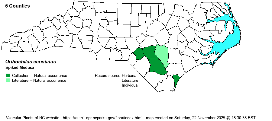 | Distribution | Records are from the Sandhills region and the southwestern Coastal Plain, with a shortly disjunct record in New Hanover County (from 1892). The only current record is from Fort Liberty (formerly named as Fort Bragg) Military Reservation in Hoke County.