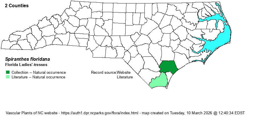 | Identification | There are so many species of Spiranthes in NC, all of which are white-flowered and of a somewhat similar overall aspect, that for most biologists separating one from another can be difficult. This is one of several savanna species that blooms in the spring. However, it can most readily be separated from others by the flowers being a bit creamy-colored as opposed to clear white, the lip being yellow inside as opposed to green or green-striped, and a flower cluster that is mostly secund (arranged all to one side of the stem) as opposed to distinctly spiraled. It averages about 1.5-2 feet tall, with a few persistent grass-like leaves at the base. The inflorescence can be up to 15 inches tall in FL, but it is probably shorter on Carolina plants. Most of the information on the identification of this orchid comes from the North American Orchid Conservation Center website. Because it is a critically endangered species, in NC and even globally, any new discovery of the species in NC would be an excellent find. | |