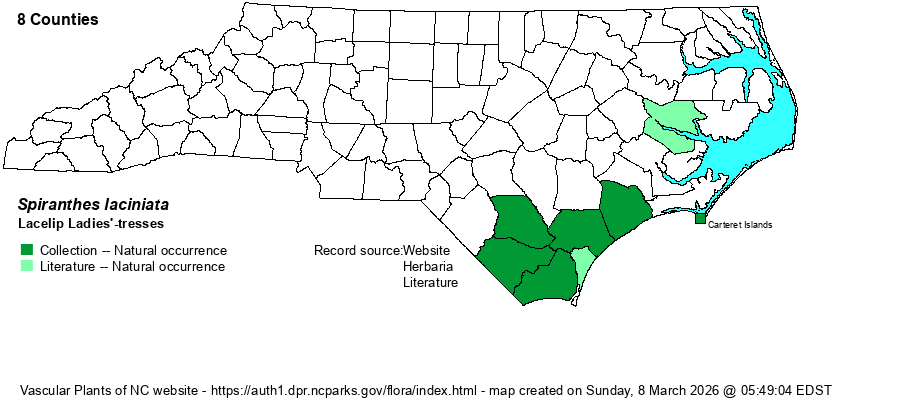 | Distribution | Restricted in the state essentially to the southeastern corner, from barrier islands of Carteret County (Portsmouth and Shackleford Islands) southwest to Columbus and Brunswick counties. There is an isolated record from Beaufort County. Specimens at Catawba College from Rowan County must certainly be incorrect.