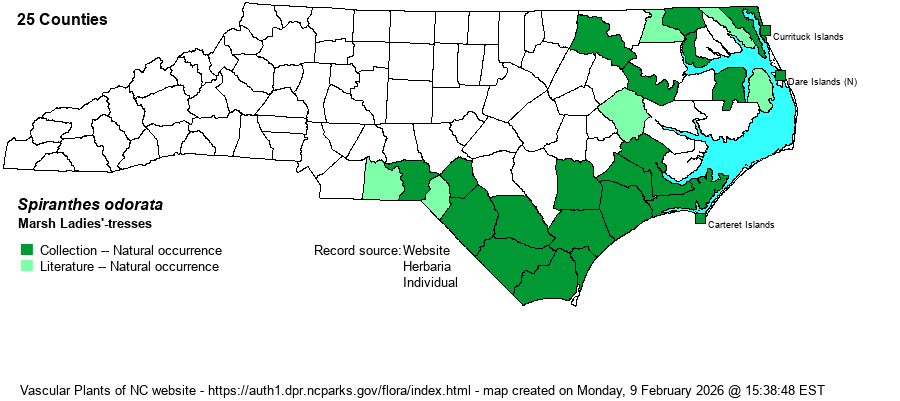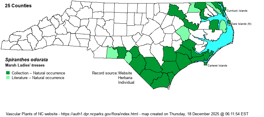 | Identification | This is a medium-to-tall Spiranthes, growing to around 1-2 feet tall, with a very tight spiral of small white flowers, as with many other ladies'-tresses. However, this species can generally be separated from others in the genus by its growing in quite wet habitats -- marshes and swamps. It also has several basal leaves that persist through the flowering period; they are broad and with rounded tips, wider than found in most other species in the genus -- giving it a "leafier" appearance than essentially all other Spiranthes found in NC. The top of the lip may often have some yellow or green, though this presence or absence of color is not overly helpful to identify the species. As can be seen from the map, this is a species of ladies'-tresses that a biologist can find on his or her own; it is not considered as rare by the NC NHP. | |