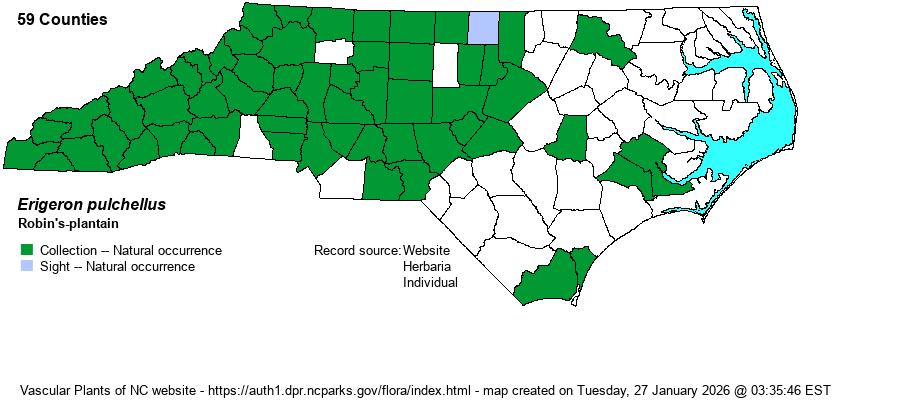 | Identification | Robin's-plantain is a perennial from a well-developed rosette of obovate basal leaves, growing only to about 1 foot tall. There are few -- 3-5 (-8) -- stem leaves, thus often giving the plant a "naked stem" appearance (i.e., scapose). Each stem is topped by 1-several broad heads with long, lavender to white rays and a yellow disk. No other fleabane looks like it, as the heads are often 1.5 inches across; and as it blooms in the spring season in forested areas, it is the only Erigeron that is considered as a "spring wildflower" on woodland walks. | |