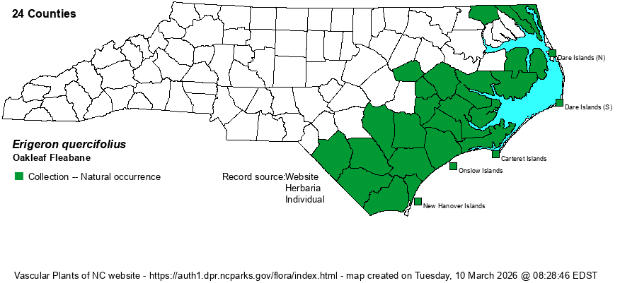| Identification | Oakleaf Fleabane resembles Philadelphia Fleabane (E. philadelphicus), but is generally smaller in stature and with smaller stem leaves and more sinuous margins on the basal leaves. However, all of these characters overlap. It is best to check length of the ray florets, which are 2.5-6 mm long (vs. 5-10 mm long); thus, spread flowers of this species are only 1/2-2/3-inch across, whereas Philadelphia Fleabane flowers can approach 1-inch across. The rays vary from lavender to pinkish to white. In general, Philadelphia Fleabane is quite scarce in the Coastal Plain, where the great majority of plants will be Oakleaf Fleabane. | |