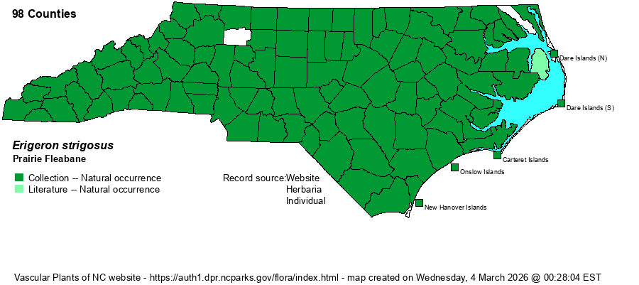 | Abundance | Generally common to very common statewide; locally abundant. Scarce on the Outer Banks and barrier islands. This is our most common fleabane species -- excluding the two "horseweed" species in the genus. | |