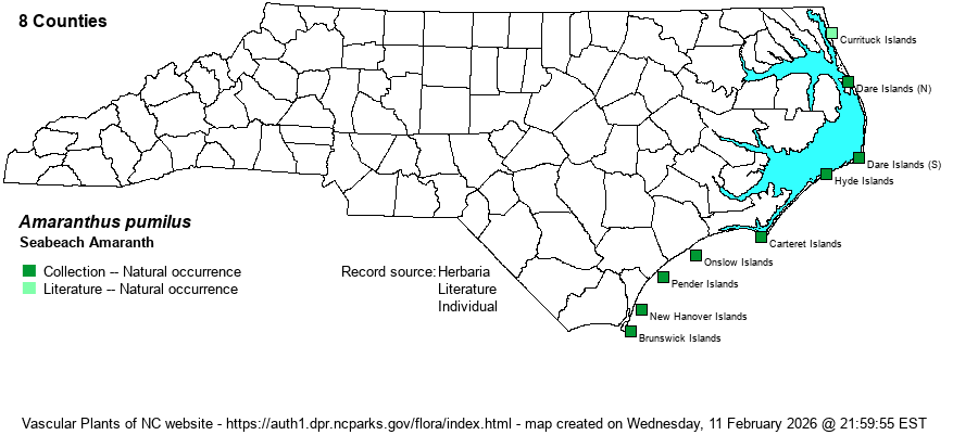 | Abundance | Rare, but as it is an annual species, populations are variable from year to year depending on beach contour, extent of sand accretion, and disturbance by vehicles and storms. Plants tend not to occupy "stable" beaches. It is listed as Federally Threatened. Though the NCNHP database has numerous records, from all 8 coastal counties, numbers of individuals in some years -- there are censuses almost annually -- are precariously low (far below 100 individuals). Note that in some years, most of the entire population of the species resides on the NC beaches. | |